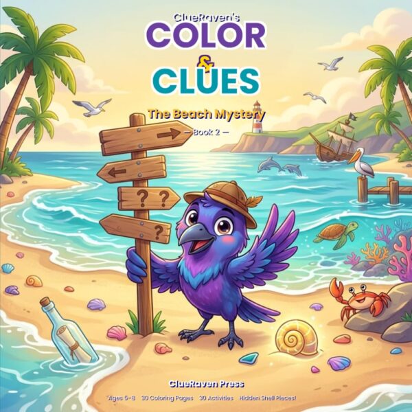 Ravi lands on a tropical island surrounded by ocean adventure! Explore tide pools teeming with sea creatures, dive through coral reefs, discover a sunken pirate ship, and search sandy beaches for hidden shell pieces. Color 30 vibrant ocean scenes, find 10 hidden shell pieces in the illustrations, and solve puzzles including ocean math, sea creature counting, underwater mazes, and pirate codes. Help Ravi assemble the shell compass and find the legendary Golden Seashell!