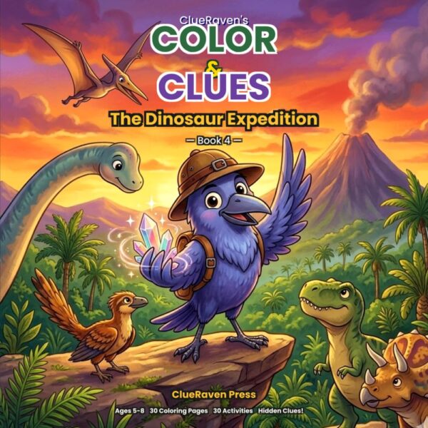 A glowing fossil portal sends Ravi back to the age of dinosaurs! Befriend a gentle Brachiosaurus family, help a T-Rex scratch an itch she can’t reach, race Pterodactyls across towering cliffs, and explore a bubbling volcano valley. Color 30 epic prehistoric scenes, find 10 hidden bone pieces in the illustrations, and solve puzzles including dino math, fossil matching, tar pit codes, and stampede counting. Help Ravi assemble the fossil map and find the Time Crystal before the meteor arrives!